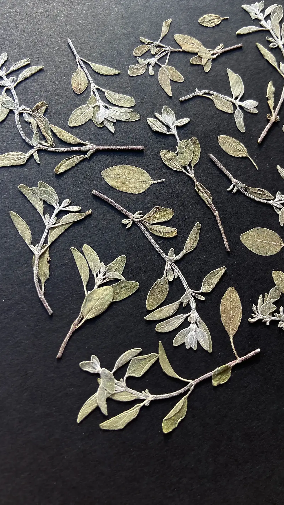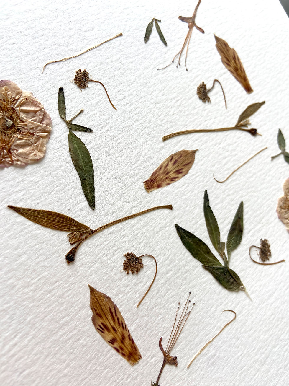 Flores secas e plantas naturais prensadas e coladas em papel texturizado 300g, PH neutro, livre de ácidos.